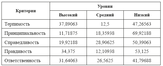 На втором этапе эксперимента нами исследовалась по методике А.Б. Купрейченко выраженность у поколения Z следующих критериев нравственности: терпимость, принципиальность, справедливость, правдивость, ответственность. В результате обработки эмпирических данных мы получили следующие результаты (таблица 1).
