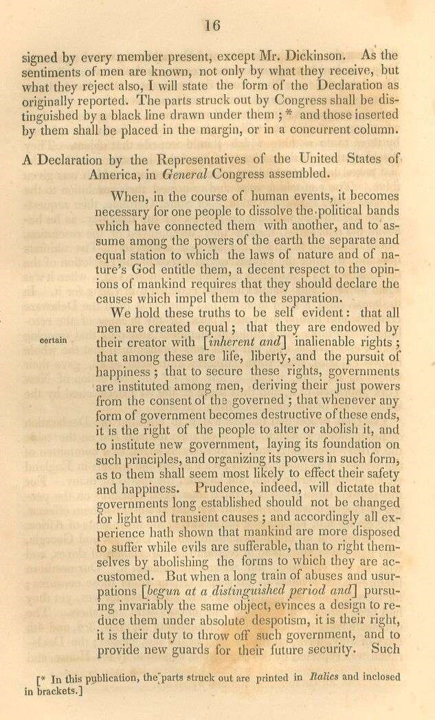 We hold these truths to be self evident: that all men are created equal; that they are endowed by their creator with [inherent and] (certain) inalienable rights; that among these are life, liberty, and the pursuit of happiness; that to secure these rights, governments are instituted among men, deriving their just powers from the consent of the governed; that whenever any form of government becomes destructive of these ends, it is the right of the people to alter or abolish it, and to institute new government, laying its foundation on such principles, and organizing its powers in such form, as to them shall seem most likely to effect their safety and happiness. Prudence, indeed, will dictate that governments long established should not be changed for light and transient causes; and accordingly all experience hath shown that mankind are more disposed to suffer while evils are sufferable, than to right themselves by abolishing the forms to which they are accustomed. But when a long train of abuses and usurpations [begun at a distinguished period and] pursuing invariably the same object, evinces a design to reduce them under absolute despotism, it is their right, it is their duty to throw off such government, and to provide new guards for their future security. Such has been the patient sufferance of these colonies; and such is now the necessity which constrains them to [expunge] (alter) their former systems of government. The history of the present king of Great Britain is a history of [unremitting] (repeated) injuries and usurpations, [among which appears no solitary act to contradict the uniform tenor of the rest, but all have] (all having) in direct object the establishment of an absolute tyranny over these states. To prove this, let facts be submitted to a candid world [for the truth of which we pledge a faith yet unsullied by falsehood.]
