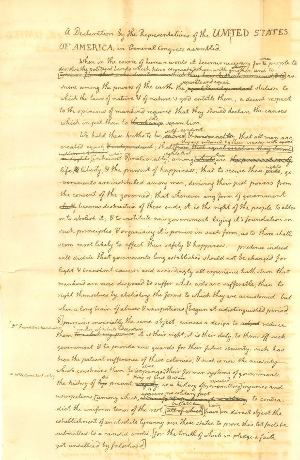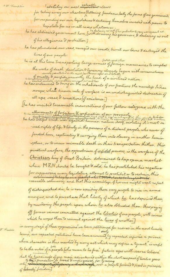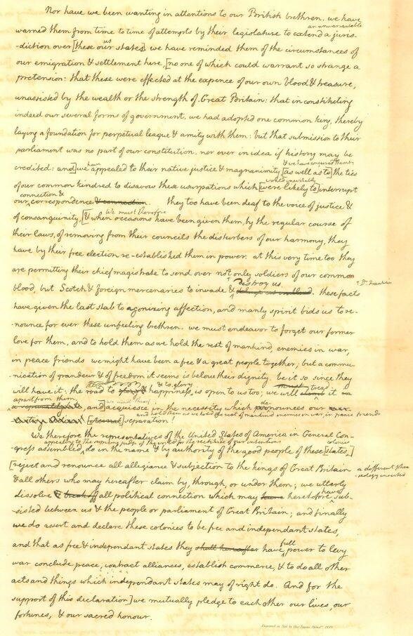 Nor have we been wanting in attentions to our British brethren. We have warned them from time to time of attempts by their legislature to extend [a] (an unwarrantable) jurisdiction over [these our states] (us). We have reminded them of the circumstances of our emigration and settlement here, [no one of which could warrant so strange a pretension: that these were effected at the expense of our own blood and treasure, unassisted by the wealth or the strength of Great Britain: that in constituting indeed our several forms of government, we had adopted one common king, thereby laying a foundation for perpetual league and amity with them: but that submission to their parliament was no part of our constitution, nor ever in idea, if history may be credited: and,] we [ ] (have) appealed to their native justice and magnanimity [as well as to] (and we have conjured them by) the ties of our common kindred to disavow these usurpations which [were likely to] (would inevitably) interrupt our connection and correspondence. They too have been deaf to the voice of justice and of consanguinity, [and when occasions have been given them, by the regular course of their laws, of removing from their councils the disturbers of our harmony, they have, by their free election, re-established, them in power. At this very time too, they are permitting their chief magistrate to send over not only soldiers of our common blood, but Scotch and foreign mercenaries to invade and destroy us. These facts have given the last stab to agonizing affection, and manly spirit bids us to renounce for ever these unfeeling brethren. We must endeavor to forget our former love for them, and hold them as we hold the rest of mankind, enemies in war, in peace friends. We might have been a free and a great people together; but a communication of grandeur and of freedom, it seems, is below their dignity. Be it so, since they will have it. The road to happiness and to glory is open to us too. We will tread it apart from them, and] (We must therefore) acquiesce in the necessity which denounces our [eternal] separation [ ]! (and hold them as we hold the rest of mankind, enemies in war, in peace friends.)