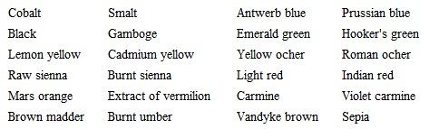 It is, I think, a piece of affectation to try to work with few colors: it saves time to have enough tints prepared without mixing, and you may at once allow yourself these twenty-four. If you arrange them in your color-box in the order I have set them down, you will always easily put your finger on the one you want.