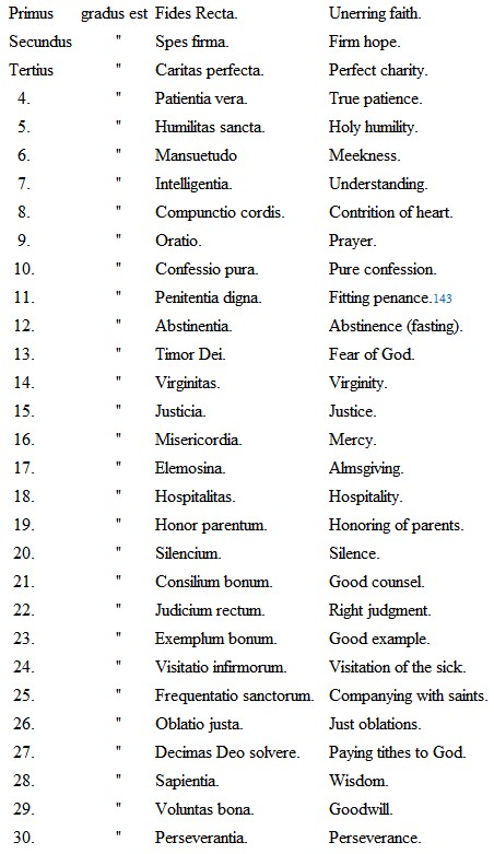§ LIII. As a preparation for this profitable exercise of wit, we have also a reconciliation of the Beatitudes as stated by St. Matthew, with those of St. Luke, on the ground that “in those eight are these four, and in these four are those eight;” with sundry remarks on the mystical value of the number eight, with which I need not trouble the reader. With St. Ambrose, however, this puerile systematization is quite subordinate to a very forcible and truthful exposition of the real nature of the Christian life. But the classification he employs furnishes ground for farther subtleties to future divines; and in a MS. of the thirteenth century I find some expressions in this commentary on St. Luke, and in the treatise on the duties of bishops, amplified into a treatise on the “Steps of the Virtues: by which every one who perseveres may, by a straight path, attain to the heavenly country of the Angels.” (“Liber de Gradibus Virtutum: quibus ad patriam angelorum supernam itinere recto ascenditur ab omni perseverante.”) These Steps are thirty in number (one expressly for each day of the month), and the curious mode of their association renders the list well worth quoting:—