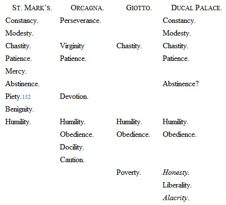 § LXIV. It is curious, that in none of these lists do we find either Honesty or Industry ranked as a virtue, except in the Venetian one, where the latter is implied in Alacritas, and opposed not only by “Accidia” or sloth, but by a whole series of eight sculptures on another capital, illustrative, as I believe, of the temptations to idleness; while various other capitals, as we shall see presently, are devoted to the representation of the active trades. Industry, in Northern art and Northern morality, assumes a very principal place. I have seen in French manuscripts the virtues reduced to these seven, Charity, Chastity, Patience, Abstinence, Humility, Liberality, and Industry: and I doubt whether, if we were but to add Honesty (or Truth), a wiser or shorter list could be made out.