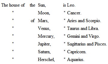 § CVII. It should be premised that, in modern astrology, the houses of the planets are thus arranged: