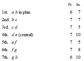 In fig. 6, Plate I. the plan of this part of the church is given on a large scale, showing that its seven external sides are arranged on a line less than a semicircle, so that if the figure were completed, it would have sixteen sides; and it will be observed also, that the seven sides are arranged in four magnitudes, the widest being the central one. The brickwork is so much worn away, that the measures of the arches are not easily ascertainable, but those of the plinth on which they stand, which is nearly uninjured, may be obtained accurately. This plinth is indicated by the open line in the ground plan, and its sides measure respectively: