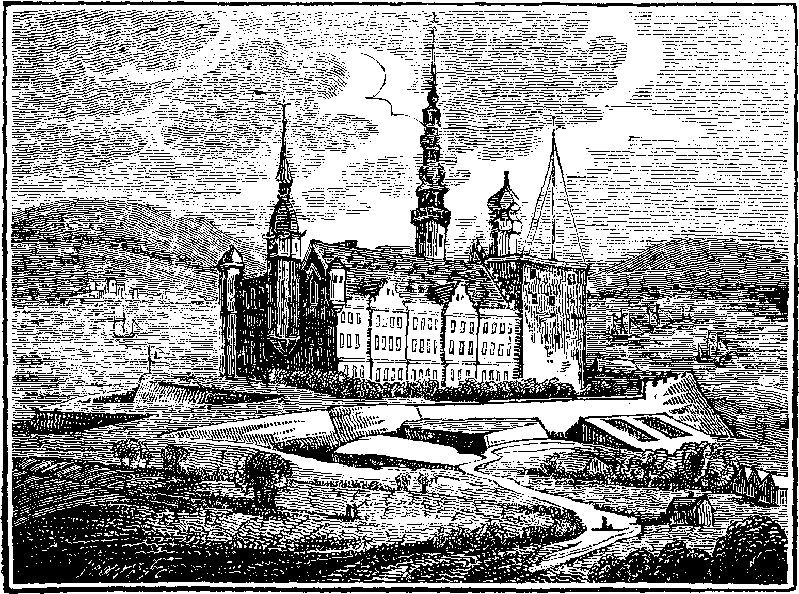 The present edifice is erected on the brow of a gently rising hill, the summit of which is gained by means of a winding walk cut through a small shrubbery. In the surrounding prospect, the town of Elsineur, on the plain beneath, presents itself ill-built, red, and without any public building, or spire, to vary its sameness. Far to the left of the city stands the castle of Kronenberg, a bold and fine feature; the waves of the Cattegut roll at its feet; and are bounded on the opposite side by the Swedish coast. When the annexed sketch was made, 400 sail of merchants' ships were lying there at anchor, which added greatly to the interest of the picture. The small village on the distant shore is Elsenberg. The forest of Kronenberg is indeed proudly situated; the form of the building, with its spires and minarets, is nobly picturesque; the fabric is of grey stone; and its innumerable windows, varied towers, and other architectural ornaments, make it a striking and beautiful contrast to the dull uniformity of the town.
