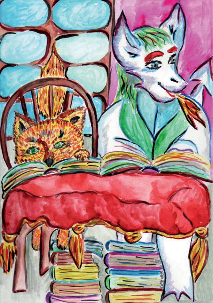 Мафи вынул совиное перо из сумки, с которой ходил в школу. На нее так же, как и на сумку собачки была наложено заклятие умещения. Мафи захотел отправится в библиотеку и почитать что-нибудь о великих волшебниках и волшебницах. Дракон прыгнул в перо и точно так же, как в больнице проломил потолок волшебной библиотеки. Тут еще одну дырку в потолке проломила Шалли. Два пера упали в руки хозяевам.