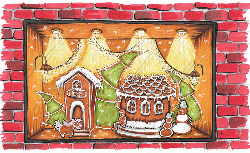 Девочка задумчиво пошла вдоль витрины с пряничным городом. Она обошла её несколько раз, пока не заметила в уголке нашего имбирного человечка, показала пальцем и сказала: