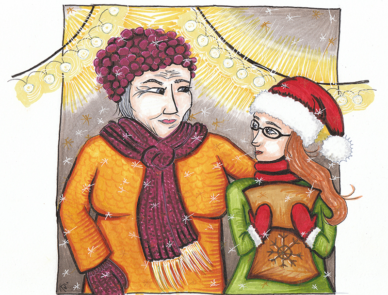 – Ну что ты так расстроилась? Да, ты не смогла поиграть в ловитки на новогодней ёлке, но как ты рассказала стих, все громко тебе хлопали! И не обращай внимания ты на дразнилки мальчишек, они просто завидуют тебе, ведь ты первая отгадала все загадки! Смотри, какие удивительные пряники! Хочешь? Я куплю тебе любой, можешь даже выбрать пряничный домик.
