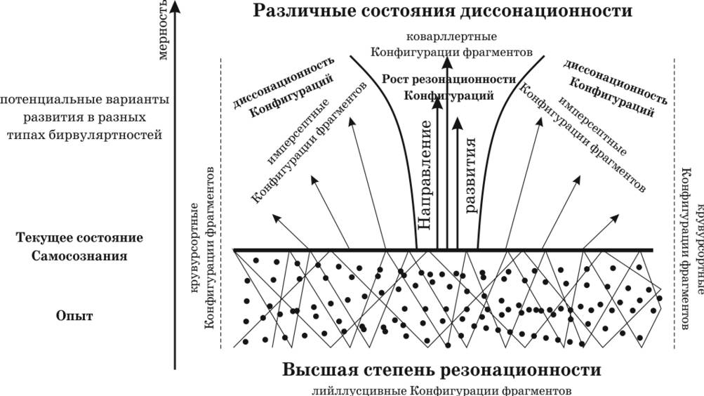 1.124. Эта Фокусная Динамика, изначально закодированная на непрерывное совершенствование взаимосвязей между Творцами как «внутри» каждого Резомирала, так и между самими протоформными Резомиралами, строго «привязана» (то есть отражает собой) не только к конкретным энергоинформационным параметрам (Конфигурациям), характеризующим степень качественности (Схему и глубину межкачественного Синтеза) каждого «участка» конфигурационной сллоогрентности, но также и к конкретным параметрам индивидуальной диссонационности менее качественных Конфигураций по отношению к их более качественным вариантам. Эти параметры определяются мною как «Временные Потоки», из которых в системах Восприятия разнотипно синтезированных Самосознаний субъективно выкристаллизовываются индивидуальные для каждого из них Представления о некой «изменчивости» и «текучести» окружающей действительности и связанная с этим логическая «последовательность» Существования всех Форм. Такое индивидуальное отношение, построенное на субъективных сравнениях разнокачественных состояний как бы «одних и тех же» объектов или явлений, названо мною диссонационным расстоянием, которое характеризует и отражает дувуйллерртную «удалённость» различных разнокачественных вариантов общей Фокусной Динамики Формо-Творцов.
