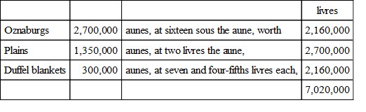 Both governments have seen with concern that their commercial intercourse does not grow as rapidly as they would wish. The system of the United States is, to use neither prohibitions nor premiums. Commerce there, regulates itself freely, and asks nothing better. Where a government finds itself under the necessity of undertaking that regulation, it would seem, that it should conduct it as an intelligent merchant would; that is to say, invite customers to purchase, by facilitating their means of payment, and by adapting goods to their taste. If this idea be just, government here has two operations to attend to, with respect to the commerce of the United States; 1, to do away, or to moderate, as much as possible, the prohibitions and monopolies of their materials for payment; 2, to encourage the institution of the principal manufactures, which the necessities or the habits of their new customers call for. Under this latter head, a hint shall be suggested, which must find its apology in the motive for which it flows; that is, a desire of promoting mutual interests and close friendship. Six hundred thousand of the laboring poor of America, comprehending slaves under that denomination, are clothed in three of the simplest manufactures possible; to wit, oznaburgs, plains and duffel blankets. The first is a linen; the two last, woollens. It happens, too, that they are used exactly by those who cultivate the tobacco and rice, and in a good degree by those employed in the whale fishery. To these manufactures they are so habituated, that no substitute will be received. If the vessels which bring tobacco, rice and whale oil, do not find them in the ports of delivery, they must be sought where they can be found; that is, in England, at present. If they were made in France, they would be gladly taken in exchange there. The quantities annually used by this description of people, and their value, are as follows: