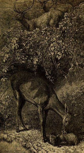 There is scarcely any animal so watchful as the female Deer, as all hunters know by practical experience. It is comparatively easy to deceive the stag who leads the herd, but to evade the eyes and ears of the hinds is a very different business, and taxes all the resources of a practised hunter. If they take such care of the herd in general, it may be imagined that their watchfulness would be multiplied tenfold when the object of their anxiety is their own young.