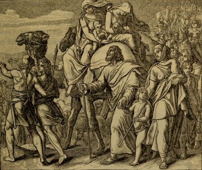 JACOB LEAVES LABAN AND RETURNS TO CANAAN WITH HIS CAMELS, SHEEP, AND CATTLE.