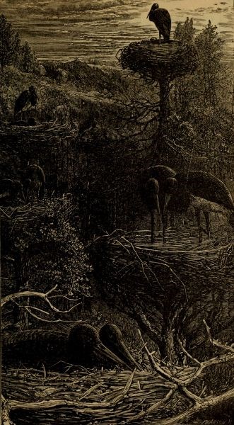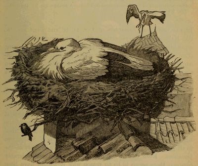 Sometimes, however, it is obliged to build in spots where it can find neither rocks nor buildings, and in such cases it builds on trees, and, like the heron, is sociable in its nesting, a whole community residing in a clump of trees. It is not very particular about the kind of tree, provided that it be tolerably tall, and strong enough to bear the weight of its enormous nest; and the reader will at once see that the fir-trees are peculiarly fitted to be the houses for the Stork.