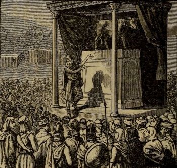 Five hundred years afterwards we find a familiar example of it in the conduct of Jeroboam, "who made Israel to sin," the peculiar crime being the open resuscitation of ox-worship. "The king made two calves of gold and said unto them, It is too much for you to go up to Jerusalem: behold thy gods, O Israel, which brought thee up out of the land of Egypt. And he set the one in Bethel, and the other put he in Dan.... And he made an house of high places, and made priests of the lowest of the people, which were not of the tribe of Levi. And Jeroboam ordained a feast … like unto the feast in Judah, and he offered upon the altar. So did he in Bethel, sacrificing unto the calves that he had made."