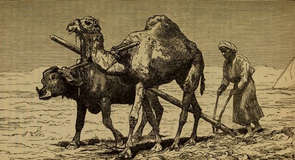 THE BHAINSA, OR DOMESTIC BUFFALO, AND CAMEL, DRAWING THE PLOUGH.