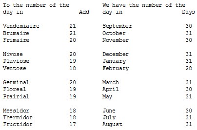 This, in brief, in this New Calendar of Romme and the Convention; calculated for the meridian of Paris, and Gospel of Jean-Jacques: not one of the least afflicting occurrences for the actual British reader of French History;—confusing the soul with Messidors, Meadowals; till at last, in self-defence, one is forced to construct some ground-scheme, or rule of Commutation from New-style to Old-style, and have it lying by him. Such ground-scheme, almost worn out in our service, but still legible and printable, we shall now, in a Note, present to the reader. For the Romme Calendar, in so many Newspapers, Memoirs, Public Acts, has stamped itself deep into that section of Time: a New Era that lasts some Twelve years and odd is not to be despised. Let the reader, therefore, with such ground-scheme, help himself, where needful, out of New-style into Old-style, called also 'slave-style, stile-esclave;'—whereof we, in these pages, shall as much as possible use the latter only.