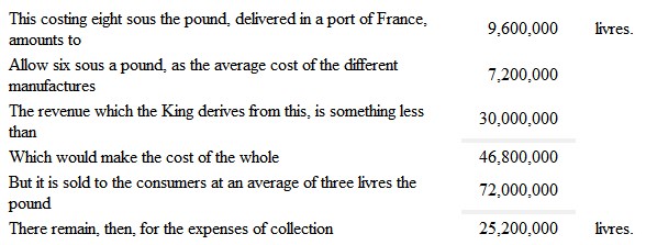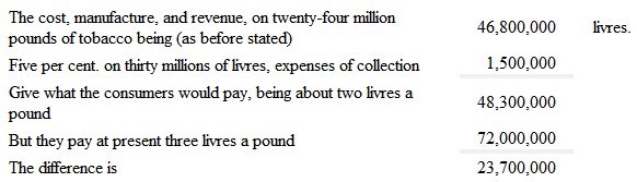 If, by a simplification of the collection of the King's duty on tobacco, the cost of that collection can be reduced even to five per cent., or a million and a half, instead of twenty-five millions; the price to the consumer will be reduced from three to two livres the pound. For thus I calculate: