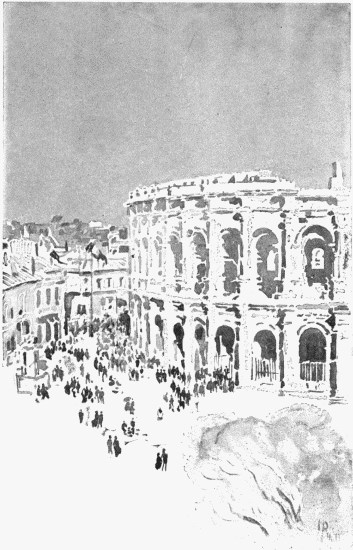 The Nîmes fountain proper—the source of all these distributed waters—is the prettiest thing in the world, a reduced copy of Vaucluse. It gushes up at the foot of the Mont Cavalier, at a point where that eminence rises with a certain cliff-like effect, and, like other springs in the same circumstances, appears to issue from the rock with a sort of quivering stillness. I trudged up the Mont Cavalier—it is a matter of five minutes—and having committed this cockneyism, enhanced it presently by another. I ascended the stupid Tour Magne, the mysterious structure I mentioned a moment ago. The only feature of this dateless tube, except the inevitable collection of photographs to which you are introduced by the doorkeeper, is the view you enjoy from its summit. This view is of course remarkably fine, but I am ashamed to say I have not the smallest recollection of it; for while I looked into the brilliant spaces of the air I seemed still to see only what I saw in the depths of the Roman baths—the image, disastrously confused and vague, of a vanished world. This world, however, has left at Nîmes a far more considerable memento than a few old stones covered with water-moss. The Roman arena is the rival of those of Verona and of Arles; at a respectful distance it emulates the Colosseum. It is a small Colosseum, if I may be allowed the expression, and is in much better preservation than the great circus at Rome. This is especially true of the external walls, with their arches, pillars, cornices. I must add that one should not speak of preservation, in regard to the arena at Nîmes, without speaking also of repair. After the great ruin ceased to be despoiled it began to be protected, and most of its wounds have been dressed with new material. These matters concern the archæologist; and I felt here, as I felt afterwards at Arles, that one of the profane, in the presence of such a monument, can only admire and hold his tongue. The great impression, on the whole, is an impression of wonder that so much should have survived. What remains at Nîmes, after all dilapidation is estimated, is astounding. I spent an hour in the Arènes on that same sweet Sunday morning, as I came back from the Roman baths, and saw that the corridors, the vaults, the staircases, the external casing, are still virtually there. Many of these parts are wanting in the Colosseum, whose sublimity of size, however, can afford to dispense with detail. The seats at Nîmes, like those at Verona, have been largely renewed; not that this mattered much, as I lounged on the cool surface of one of them and admired the mighty concavity of the place and the elliptical sky-line, broken by uneven blocks and forming the rim of the monstrous cup—a cup that had been filled with horrors. And yet I made my reflections: I said to myself that though a Roman arena is one of the most impressive of the works of man, it has a touch of that same stupidity which I ventured to discover in the Pont du Gard. It is brutal; it is monotonous; it is not at all exquisite. The Arènes at Nîmes were arranged for a bull-fight—a form of recreation that, as I was informed, is much dans les habitudes Nîmoises, and very common throughout Provence, where (still according to my information) it is the usual pastime of a Sunday afternoon. At Arles and Nîmes it has a characteristic setting, but in the villages the patrons of the game make a circle of carts and barrels, on which the spectators perch themselves. I was surprised at the prevalence in mild Provence of the Iberian vice, and hardly know whether it makes the custom more respectable that at Nîmes and Arles the thing is shabbily and imperfectly done. The bulls are rarely killed, and indeed often are bulls only in the Irish sense of the term—being domestic and motherly cows. Such an entertainment of course does not supply to the arena that element of the exquisite which I spoke of as wanting. The exquisite at Nîmes is mainly represented by the famous Maison Carrée. The first impression you receive from this delicate little building, as you stand before it, is that you have already seen it many times. Photographs, engravings, models, medals, have placed it definitely in your eye, so that from the sentiment with which you regard it curiosity and surprise are almost completely, and perhaps deplorably, absent. Admiration remains, however—admiration of a familiar and even slightly patronising kind. The Maison Carrée does not overwhelm you; you can conceive it. It is not one of the great sensations of antique art; but it is perfectly felicitous, and, in spite of having been put to all sorts of incongruous uses, marvellously preserved. Its slender columns, its delicate proportions, its charming compactness, seem to bring one nearer to the century that built it than the great superpositions of arenas and bridges, and give it the interest that vibrates from one age to another when the note of taste is struck. If anything were needed to make this little toy-temple a happy production, the service would be rendered by the second-rate boulevard that conducts to it, adorned with inferior cafés and tobacco-shops. Here, in a respectable recess, surrounded by vulgar habitations and with the theatre, of a classic pretension, opposite, stands the small "square house," so called because it is much longer than it is broad. I saw it first in the evening, in the vague moonlight, which made it look as if it were cast in bronze. Stendhal says, justly, that it has the shape of a playing-card, and he expresses his admiration for it by the singular wish that an "exact copy" of it should be erected in Paris. He even goes so far as to say that in the year 1880 this tribute will have been rendered to its charms; nothing would be more simple, to his mind, than to "have" in that city "le Panthéon de Rome, quelques temples de Grèce." Stendhal found it amusing to write in the character of a commis-voyageur, and sometimes it occu