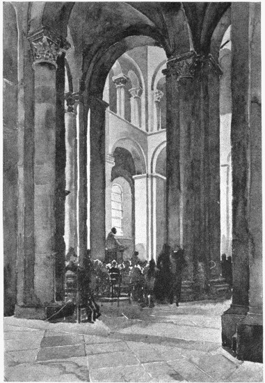 The theatre has a voice as well, but it lingers on the ear of time with a different music. The Roman theatre at Arles seemed to me one of the most charming and touching ruins I had ever beheld; I took a particular fancy to it. It is less than a skeleton—the arena may be called a skeleton—for it consists only of half a dozen bones. The traces of the row of columns which formed the scene—the permanent back-scene—remain; two marble pillars—I just mentioned them—are upright, with a fragment of their entablature. Before them is the vacant space which was filled by the stage, with the line of the proscenium distinct, marked by a deep groove impressed upon slabs of stone, which looks as if the bottom of a high screen had been intended to fit into it. The semicircle formed by the seats—half a cup—rises opposite; some of the rows are distinctly marked. The floor, from the bottom of the stage, in the shape of an arc of which the chord is formed by the line of the orchestra, is covered by slabs of coloured marble—red, yellow and green—which, though terribly battered and cracked to-day, give one an idea of the elegance of the interior. Everything shows that it was on a great scale: the large sweep of its enclosing walls, the massive corridors that passed behind the auditorium and of which we can still perfectly take the measure. The way in which every seat commanded the stage is a lesson to the architects of our epochs, as also the immense size of the place is a proof of extraordinary power of voice on the part of the Roman actors. It was after we had spent half an hour in the moonshine at the arena that we came on to this more ghostly and more exquisite ruin. The principal entrance was locked, but we effected an easy escalade, scaled a low parapet, and descended into the place behind the scenes. It was as light as day, and the solitude was complete. The two slim columns, as we sat on the broken benches, stood there like a pair of silent actors. What I called touching just now was the thought that here the human voice, the utterance of a great language, had been supreme. The air was full of intonations and cadences; not of the echo of smashing blows, of riven armour, of howling victims and roaring beasts. The spot is, in short, one of the sweetest legacies of the ancient world; and there seems no profanation in the fact that by day it is open to the good people of Arles, who use it to pass, by no means in great numbers, from one part of the town to the other; treading the old marble floor and brushing, if need be, the empty benches. This familiarity does not kill the place again; it makes it, on the contrary, live a little—makes the present and the past touch each other.