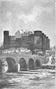 "Stupidly and vulgarly modernised"—that is another flower from my note-book, and note-books are not obliged to be reasonable. "There are some narrow and tortuous streets, with a few curious old houses," I continue to quote; "there is a castle, of which the exterior is most extraordinary, and there is a cathedral of moderate interest." It is fair to say that the Château d'Angers is by itself worth a pilgrimage; the only drawback is that you have seen it in a quarter of an hour. You cannot do more than look at it, and one good look does your business. It has no beauty, no grace, no detail, nothing that charms or detains you; it is simply very old and very big—so big and so old that this simple impression is enough, and it takes its place in your recollections as a perfect specimen of a superannuated stronghold. It stands at one end of the town, surrounded by a huge, deep moat, which originally contained the waters of the Maine, now divided from it by a quay. The water-front of Angers is poor—wanting in colour and in movement; and there is always an effect of perversity in a town lying near a great river and yet not upon it. The Loire is a few miles off; but Angers contents itself with a meagre affluent of that stream. The effect was naturally much better when the vast dark bulk of the castle, with its seventeen prodigious towers, rose out of the protecting flood. These towers are of tremendous girth and solidity; they are encircled with great bands, or hoops, of white stone, and are much enlarged at the base. Between them hang high curtains of infinitely old-looking masonry, apparently a dense conglomeration of slate, the material of which the town was originally built (thanks to rich quarries in the neighbourhood), and to which it owed its appellation of the Black. There are no windows, no apertures, and to-day no battlements nor roofs. These accessories were removed by Henry III., so that, in spite of its grimness and blackness, the place has not even the interest of looking like a prison; it being, as I suppose, the essence of a prison not to be open to the sky. The only features of the enormous structure are the blank, sombre stretches and protrusions of wall, the effect of which, on so large a scale, is strange and striking. Begun by Philip Augustus and terminated by St. Louis, the Château d'Angers has of course a great deal of history. The luckless Fouquet, the extravagant minister of finance of Louis XIV., whose fall from the heights of grandeur was so sudden and complete, was confined here in 1661, just after his arrest, which had taken place at Nantes. Here also Huguenots and Vendeans suffered effective captivity.