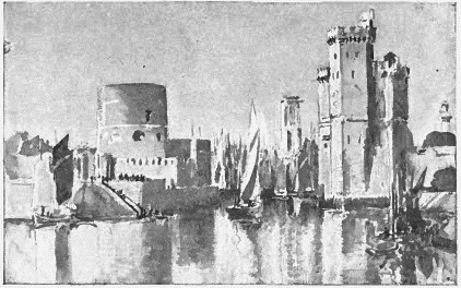 To say that I found any traces of the siege would be to misrepresent the taste for vivid whitewash by which La Rochelle is distinguished to-day. The only trace is the dent in the marble top of the table on which, in the hôtel de ville, Jean Guiton, the mayor of the city, brought down his dagger with an oath when in 1628 the vessels and regiments of Richelieu closed about it on sea and land. This terrible functionary was the soul of the resistance; he held out from February to October in the midst of pestilence and famine. The whole episode has a brilliant place among the sieges of history; it has been related a hundred times, and I may only glance at it and pass. I limit my ambition in these light pages to speaking of those things of which I have personally received an impression, and I have no such impression of the defence of La Rochelle. The hôtel de ville is a pretty little building, in the style of the Renaissance of Francis I.; but it has left much of its interest in the hands of the restorers. It has been "done up" without mercy; its natural place would be at Rochelle the New. A sort of battlemented curtain, flanked with turrets, divides it from the street and contains a low door (a low door in a high wall is always felicitous), which admits you to an inner court, where you discover the face of the building. It has statues set into it and is raised upon a very low and very deep arcade. The principal function of the deferential old portress who conducts you over the place is to call your attention to the indented table of Jean Guiton; but she shows you other objects of interest besides. The interior is absolutely new and extremely sumptuous, abounding in tapestries, upholstery, morocco, velvet, satin. This is especially the case with a really beautiful grande salle, where, surrounded with the most expensive upholstery, the mayor holds his official receptions. (So at least said my worthy portress.) The mayors of La Rochelle appear to have changed a good deal since the days of the grim Guiton; but these evidences of municipal splendour are interesting for the light they throw on French manners. Imagine the mayor of an English or an American town of twenty thousand inhabitants holding magisterial soirées in the town hall! The said grande salle, which is unchanged in form and in its larger features, is, I believe, the room in which the Rochelais debated as to whether they should shut themselves up, and decided in the affirmative. The table and chair of Jean Guiton have been restored, like everything else, and are very elegant and coquettish pieces of furniture—incongruous relics of a season of starvation and blood. I believe that Protestantism is somewhat shrunken to-day at La Rochelle, and has taken refuge mainly in the haute société and in a single place of worship. There was nothing particular to remind me of its supposed austerity as, after leaving the hôtel de ville, I walked along the empty porticos and out of the Tour de l'Horloge, which I have already mentioned. If I stopped and looked up at this venerable monument, it was not to ascertain the hour, for I foresaw that I should have more time at La Rochelle than I knew what to do with; but because its high, grey, weather-beaten face was an obvious subject for a sketch.