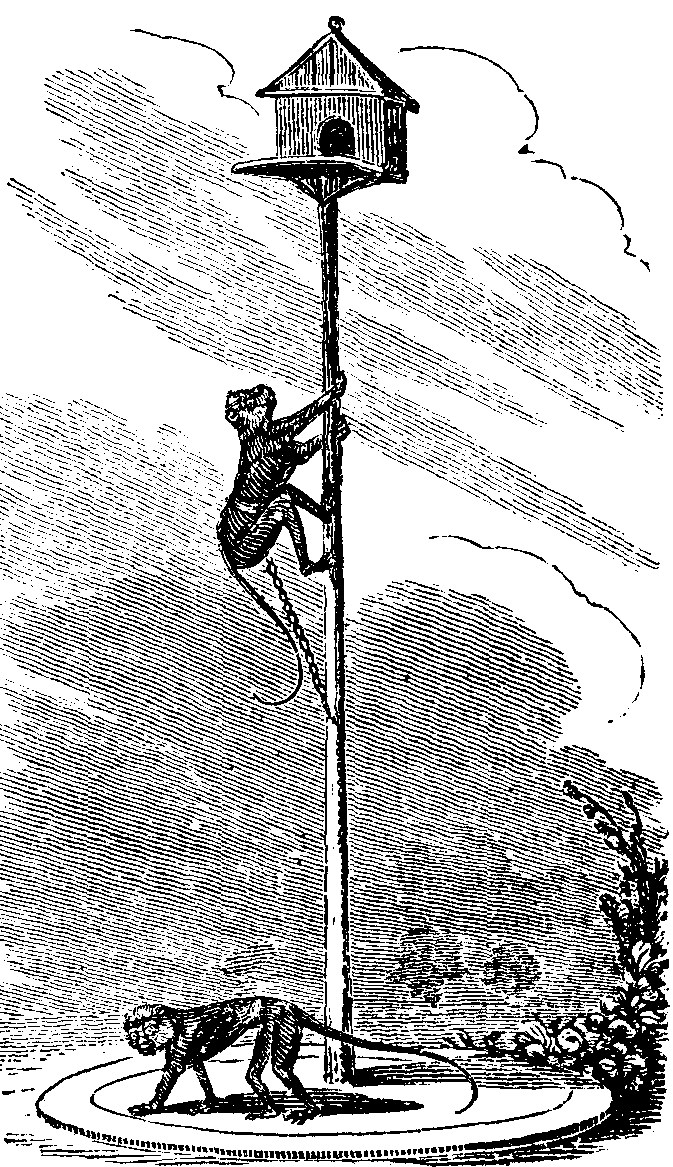 These are distributed beside the walks. The monkey is attached by a chain to a ring loosely round the pole, by which means he ascends and descends at pleasure.