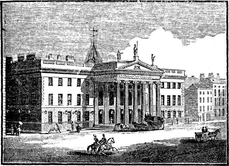 The general post-office, Dublin, was at first held in a small building on the site of the Commercial Buildings, and was afterwards removed to a larger house opposite the bank on College Green (since converted into the Royal Arcade;) and on January 6, 1818, the new post-office in Sackville-street was opened for business.