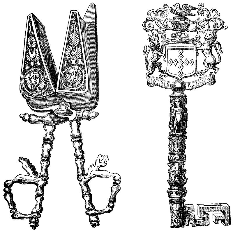 The first of these archæological rarities is a pair of Snuffers, found in Dorsetshire sixty-four years since, and engraved in Hutchins's history of that county. They were discovered, says the historian, "in the year 1768, in digging the foundation of a granary, at the foot of a hill adjoining to Corton mansion house (formerly the seat of the respectable family of the Mohuns), in the parish of St. Peter, Portisham. They are of brass, and weigh six ounces: the great difference between these and the modern utensils of the same nature and use is, that these are in shape like a heart fluted, and consequently terminate in a point. They consist of two equal lateral cavities, by the edges of which the snuff is cut off, and received into the cavities, from which it is not got out without particular application and trouble."