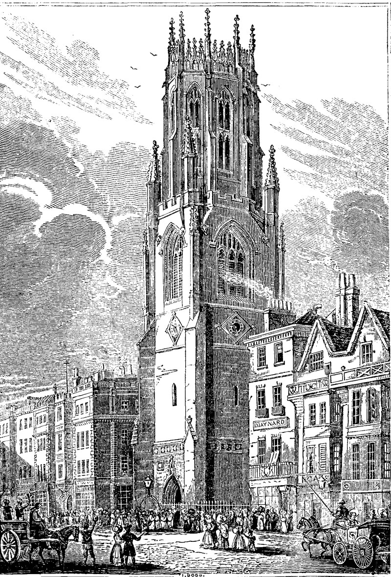 The church has been built from the designs and under the superintendance of John Shaw, Esq., F.R. and A.S. the architect of Christ's Hospital. The tower is of the Kelton stone, a very superior kind of freestone, of beautiful colour, from the county of Rutland. Of this material King's College Chapel, Cambridge, and many other of our finest edifices have been constructed. The tower has below an entrance doorway, finished with rich mouldings and tracery; on each side are the arms of his Majesty and the City of London. Above is a clock with three dials, and a belfry to admit the fine set of bells2 from the old church, the sound of which will doubtless receive effect through the four large upper windows which are the main features of the tower. Above these windows, the tower, hitherto square, becomes gradually octagonal, springing from corbeled heads; till terminated by four octagonal pinnacles, and crowned by an octagonal moulded battlement. Upon the tower is an enriched stone lantern, perforated with gothic windows of two heights, each angle having a buttress and enriched finial; the whole being terminated by an ornamental, pierced, and very rich crown parapet. The height of the tower, to the battlements, is 90 feet; and the whole height of the tower and lantern is 130 feet.