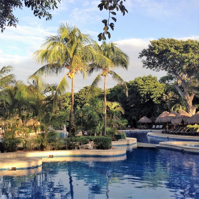 На курорте, напротив мексиканского острова Косумель у бассейна под травяными тентами рядом с нами странная пара. Они, наверное, самые старые на берегу. Им что-то за 80+ Говорят по-русски, что не редкость в этих местах. Она кого-нибудь обсуждает, он говорит ей комплименты.