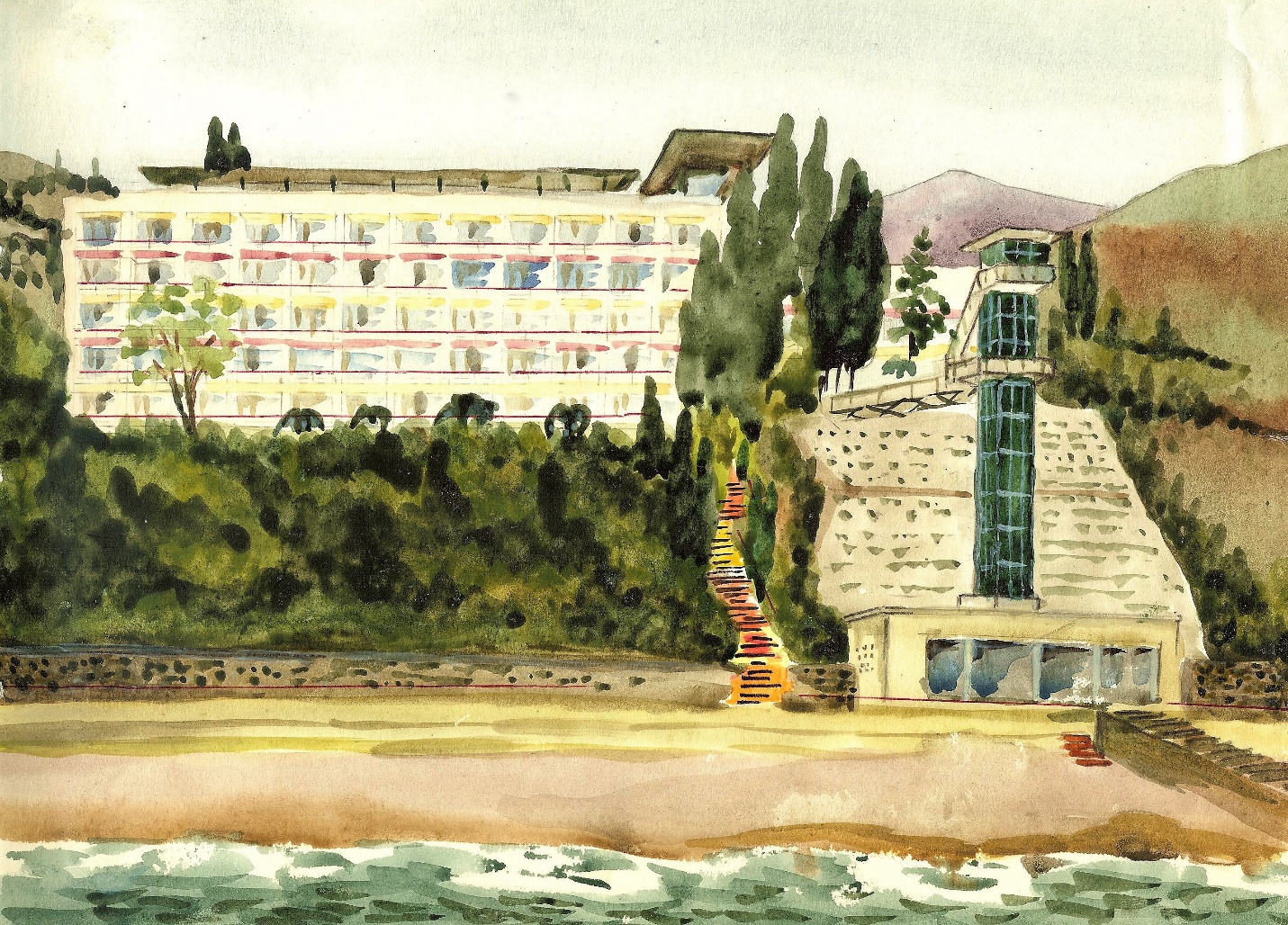 Экскурсии разные. Есть и морская. Вода пенилась, клокотала за кормой а волны спешили и отставали, чтобы уступить место другим, спешащим и отстающим волнам. Впереди был утёс и дом на горе. Наш пансионат. Бело-жёлтое с кремовым здание с башенкой, утопающее в зелени. За ним вдалеке громоздились молочно- сизые горы, детали которых смазывала даль, а потом открылся и городок, карабкающийся на гору. Мы причалили к берегу между двух барж и драгой, непонятно как и для чего попавшей сюда?