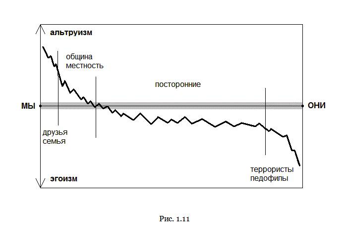 Наиболее консервативна религия – она стремится сохранить моральные структуры древности, изображенные еще миллион лет назад на рис. 1.2. И хотя религии, бывает, различаются, особенно в отношении к эгоизму, в целом подход общий. Единоверцы, местная община, родные – тот круг, который требует самопожертвования; отступники, неверные и безбожники – неполноценные люди, поступать с которыми следует морально-насильственно, как минимум – т.е. по возможности обращая в свою веру, этакий моральный трайбализм. Про максимум, т.е. истребление и порабощение, помышляют лишь немногие застрявшие в глубоком средневековье. С религией схожа государственная идеология, которая из граждан делает должников во имя родины и проигравших в социальной борьбе, а из прочих – к счастью не всех, а только избранных – врагов. Правда, этим избранным не везет серьезно, поскольку государственная машина редко останавливается, пока не начинает их физически уничтожать. Прочие большие и маленькие идеологии, а фактически групповые морали, различаются только критерием своих – этничность, язык, цвет кожи, уровень доходов, место рождения, экономические предпочтения, общее место службы, совместные темные делишки.
