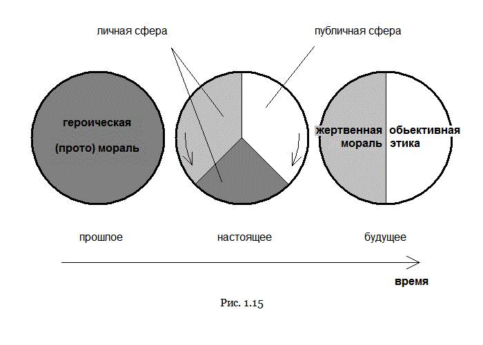 А что случится с первоисточником нравственности – героической моралью? Мы как-то забыли о ней, а ведь борьба с насилием без нее невозможна. Роль ее, как ни грустно, уменьшится, поскольку бороться за свободу можно будет не вставая со стула. На нашем последнем на сегодня рисунке – 1.15, я решил свести все главные нравственные явления вместе. Надеюсь он понятен и без лишних пояснений, разве только в качестве небольшого резюме. Сперва человек, точнее его лучшая часть, был охвачен только героической протоморалью, которую он получил от коллектива и пересадил внутрь себя в процессе борьбы с природным эгоизмом. Там внутри, она потом расщепилась на обьективную, хотя и сокрытую в шелухе норм, этику и жертвенную, возведенную на пьедестал, мораль. Ныне этика еще слаба, как и публичная сфера, она занимает небольшую часть души. Жертвенная мораль, включая ее героическую часть, пока сильнее – рисунок показывает, что личная сфера, включающая не только родных и близких, но и сотрудников, и подельников, и соседей, и соотечественников, превалирует. Но по мере прогресса, когда героическая борьба со злом потеряет актуальность и уйдет в прошлое, а личная сфера займет подобающее ей положение,