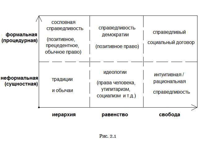 Чтобы лучше уяснить эти соображения, я попробовал свести их в табличку (рис. 2.1). Оказалось, что виды справедливости можно упорядочить в своеобразные ступени прогресса, направления которого отмечены стрелками. Получилось два направления. Первое – формализация, стрелка вверх. Неформальные понятия о справедливости (нижний ряд) определяют сущность построенных на их основе формальных систем права (верхний). Так, традиции лежат в основе всех видов сословного права, идеологии рождают идеи для демократического законодательства, а истинная справедливость является фундаментом настоящего социального договора. Прогресс тут в том, что сам факт формализации – это движение от несвободы к свободе, потому что любое ограничение насилия нормами – шаг к договору. Но и степень формализации норм может отличаться – и не только широтой охвата сторон жизни. Например, процедура предполагает относительную стабильность. Если формальные нормы пересматриваются слишком часто, хоть и в рамках процедуры – само понятие нормы теряет смысл. Аналогично, степени существуют и в рамках стихийной, неформальной справедливости. Пока одни нормы смутно проявляются в головах у ограниченного круга людей, другие уже являются общепринятыми, хоть и пока неписанными. Прогресс в этом направлении идет, таким образом, снизу вверх – от интуитивного ощущения справедливости – через ее осознание и попытки формализации – к четкой, ясной и стабильной процедуре, ее реализующей.