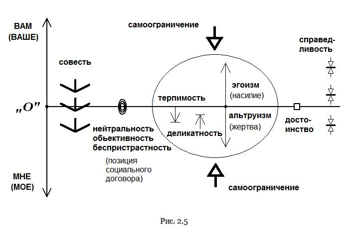 Как перейти к договору? Надо ограничить насилие. Начнем со стрелок Б. Легко видеть, что каждый хотел бы в сущности одного – чтобы насилие к нему исчезло. Т.е. приемлемый уровень Б – не героический, а минимальный, доступный каждому, да еще и стремящийся к черте. Сложнее обстоит дело со стрелками А. Во-1-х, насилие к другим людям – обычно следствие насилия или внешнего, или нашей природы, т.е. стрелки А и Б связаны между собой и поэтому отказ от насилия требует некоторого усилия. В-2-х, человеку свойственно лучше чувствовать насилие по отношению к себе, отчего стрелки А имеют тенденцию хотеть быть больше. В-3-х, сильным насилие выгодно. Поэтому здесь договор идет трудно и приемлемый уровень А высок – люди способны согласовать лишь отказ от самого вопиющего насилия. Но это пока! Ибо стрелки А и Б – это одни и те же стрелки, только для разных людей. А значит договор устраивающий всех лежит там, где совпадают приемлемые уровни А и Б – на черте!