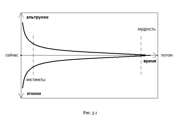 Будучи с детства не в ладах с книжками без картинок, я решил опять прибегнуть к помощи графики. У меня получился рис. 3.1, где я изобразил зависимость альтруизма и эгоизма от времени. Тут вроде все тривиально, особенно если сравнить его с уже знакомым нам рис. 1.6. Но несмотря на кажущуюся их идентичность, внешность обманчива! На рис. 1.6 время историческое и общее, мы смотрим как бы назад и видим, как меняется проявление чувств в жизни людей, а на рис. 3.1 время индивидуальное, мы смотрим теперь вперед. Если мгновенный результат вызывается мгновенными эмоциями, то в пределе остается только мудрость и никаких чувств. Также надо иметь в виду, что картинка никак не отмечает близость к субьекту других людей – на которых направлены, или от кого зависят, или кого затрагивают его действия. Очевидно, что альтруизм больше ассоциируются с личной сферой, а эгоизм – с публичной, вследствие чего вероятна асимметрия рисунка. Асимметрия также должна бы появиться в силу того, что эффект альтруистичных действий отстоит обычно дальше эгоистичных. Простите друзья, но я, как водится, предпочел эстетику истине.