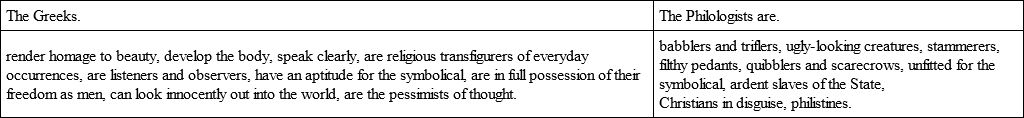 Even in the best of cases, philologists seek for no more than mere "rationalism" and Alexandrian culture – not Hellenism.