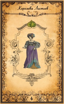 Королева Листьев часто выступает в раскладе, как хранительница очага, бабушка или взрослая мама, свекровь, тетя. Ее можно сравнить с астрологическим образом Весты, богини – хранительницы дома и семьи. Даже ее символ напоминает очаг.