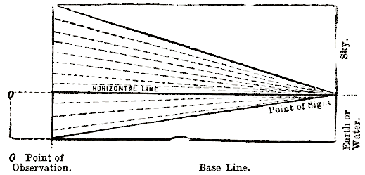Fig. 1 is a section of the linear construction of a picture, and will show how the lines converge from the point of observation to the point of sight. Artists, in constructing a landscape of an ordinary form, allot to the sky generally about twice the space between the base and horizontal lines. But for portraits and groups, where the figures are of the greatest importance and nearer to the eye, the proportion of sky and earth is reversed, so as to give increased value to the principal figures, by making them apparently larger, and still preserving the proper relation between them and the horizontal line (see fig. 2). This diagram represents the conditions of a full-length carte portrait, where the governing horizontal line is on a level with the camera. If a pictorial background, painted in the usual way, with the horizontal line low in the picture, is now placed behind the sitter, the resulting photograph will be incongruous and offensive. It will be seen, on referring to fig. 2, that all the lines below the horizon must of necessity run up to it, no matter how high the horizontal line may be, for it is impossible to have two horizons in one picture; that is, a visible horizon in the landscape background, and an imaginary one for the figure, with the horizontal line of the background far below the head of the figure, and the head far up in the sky. The head of a human figure can only be seen so far above the horizontal line under certain conditions; such as being elevated above the observer by being mounted on horseback, standing on higher ground, or otherwise placed considerably above the base line, none of which conditions are present in a studio. Whenever the observed and observer are on the same level, as must be the case when a photographer is taking the portrait of a sitter in his studio, the head of the subject could not possibly be seen so high in the sky, if the lens included a natural background instead of a painted one. As, for convenience, the painted background is intended to take the place of a natural one, care should be taken that the linear and aerial perspectives should be as true to nature as possible, and in perfect harmony with the size of the figures. The lens registers, on the prepared plate, the relative proportions of natural objects as faithfully as the retina receives them through the eye, and if we wish to carry out the illusion of pictorial backgrounds correctly, we must have the linear construction of the picture, which is intended to represent nature, as true in every respect as nature is herself.