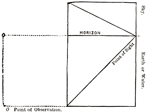 Pictorial backgrounds have usually been painted on the same principle as a landscape picture, and one of the earliest things the painter has to determine is, where he shall represent that line where the sky and earth appear to meet—technically, the horizontal line. This settled, all the lines, not vertical or horizontal in the picture, below this are made to appear to rise up to it, and those above descend, and if all these are in due proportion the perspective is correct, no matter whether this governing line is assumed to be in the upper, lower, or middle part of the picture. A painter can suppose this imaginary line to be at any height he pleases in his picture, and paint accordingly. In photography it is invariable, and is always on a level with the lens of the camera. To illustrate the relation of the horizontal line to the human figure, when a pictorial background is to be introduced, let us imagine that we are taking a portrait out-of-doors, with a free and open country behind the person standing for his carte-de-visite. The camera and the model are, as a matter of course, on the same level. Now focus the subject and observe the linear construction of the landscape background of nature. See how all the lines of the objects below the level of the lens run up to it, and the lines of the objects above run down to it. Right across the lens is the horizontal line, and the centre is the point of sight, where all the lines will appear to converge. Suppose the lens to be on a level with the face of the subject, the horizontal line of the picture produced on the ground glass will be as near as possible as high as the eyes of the subject. Trees and hills in the distance will be above, and the whole picture will be in harmony. This applies to interior views as well, but the ocular demonstration is not so conclusive, for the converging lines will be cut or stopped by the perpendicular wall forming the background. Nevertheless, all the converging lines that are visible will be seen to be on their way to the point of sight. Whether a natural background consisted of an interior, or comprised both—such as a portion of the wall of a room and a peep through a window on one side of the figure—the conditions would be exactly the same. All the lines above the lens must come down, and all that are below must go up. The following diagrams will illustrate this principle still more clearly.
