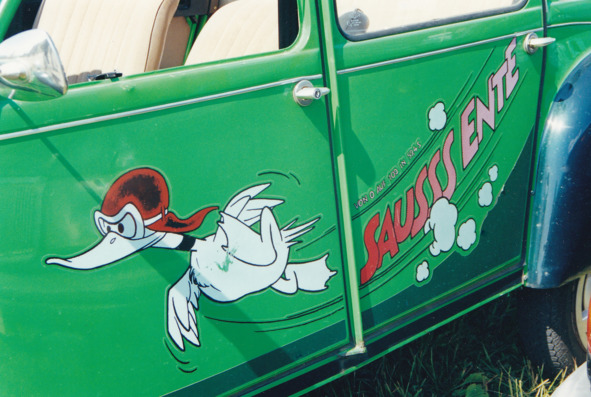 Такого бравого утенка можно было увидеть на дверях одного из редких в России Citroen 2CV (госномер р711кр50). Кстати, была малоизвестная спецсерия «утят» с таким рисунком, но не знаю, относится ли к ней авто на фото или это импровизация его хозяина
