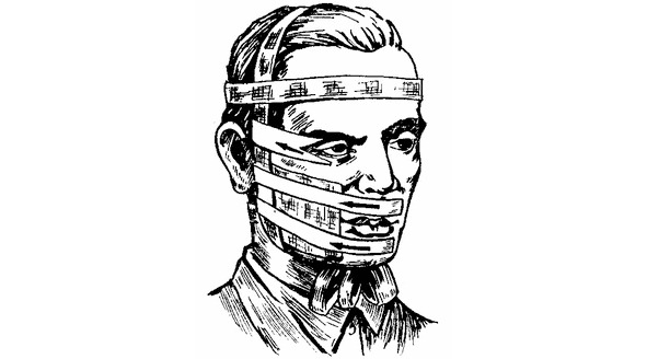 – в первые недели необходимо поддерживать больную сторону лица повязкой. Сложенный по диагонали платок накладывается на подбородок и завязывается узлом на темени. Под повязкой мышцы здоровой стороны следует слегка сместить вниз, а больной поднять. Как альтернативу данной методике можно использовать более современный метод кинезиологического тейпирования.