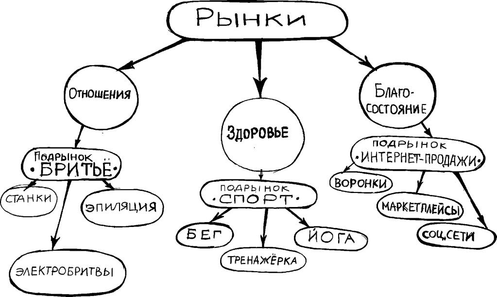 Простой пример. Человек хочет побриться. Зачем? Хочет выглядеть приятно для семьи, коллег, для общества. Ради хороших отношений. То есть на рынке отношений существует подрынок бритья. А на каждом подрынке есть ниша – конкретный способ удовлетворения потребности. Кто-то будет использовать электрическую бритву, кто-то – бритву с лезвием, опасным или безопасным.