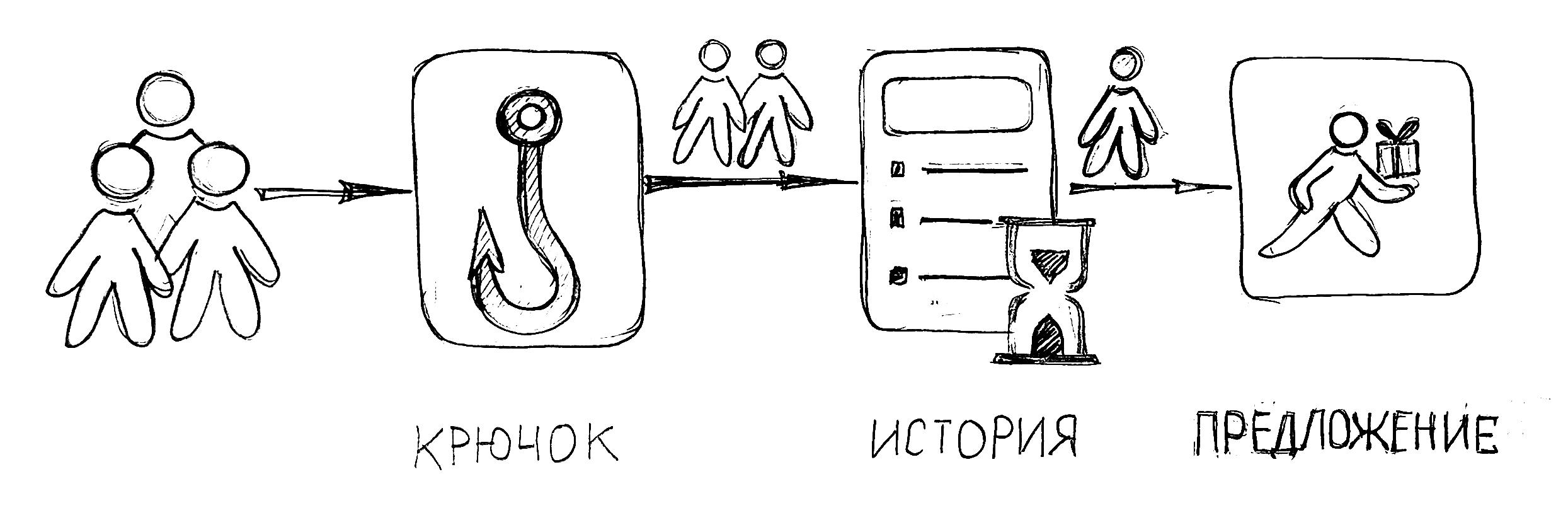 Пробиться через медийный шум и остановить клиента, который мчится в потоке на бешеной скорости, нам помогает концепция «Крючок, история, предложение».