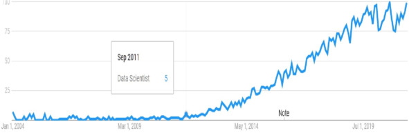 Как бы вы выбрали себе профессию data scientist, поставили бы целью в жизни стать «учёным данных», когда это слово появилось в обиходе где-то в конце 2011 года? Восемь лет спустя это популярнейшая «профессия», фронтир прогресса и мечта студента. Но вот беда, популярность её начинает падать в 2019 году, в 2021 году, через эти восемь лет опять случился какой-то очередной подрыв! Disruption technologies опять что-то изменили. Вот данные Гугла (популярность запроса data scientist по годам):