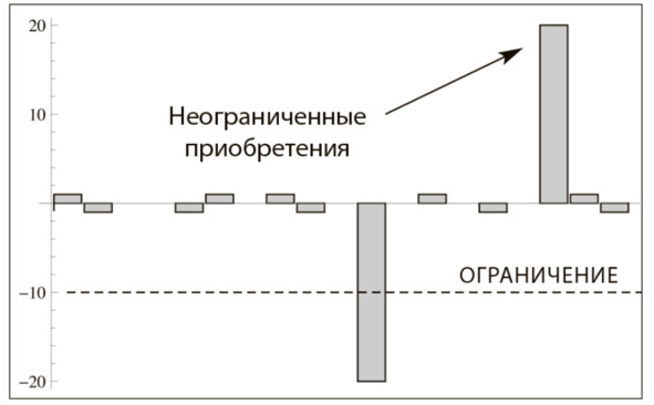 Главный вид ошибки: ставки, при которых можно проиграть неограниченно много. Такие ставки – ошибки, их просто не нужно делать. Нужно блюсти асимметричность: если потери будут, то они не должны превышать заранее известного маленького размера, а если выигрыш – то по величине он может быть неограниченно большим. На этой асимметричности малого проигрыша и возможно огромного выигрыша можно получать прибыль чисто статистически, если хоть как-то оценивать вероятности. А средних ставок с «умеренным риском» делать не нужно, это разорительно. Талеб по основной своей специальности как раз был трейдер на рынке ценных бумаг, поэтому он свои примеры и образы главным образом брал оттуда.