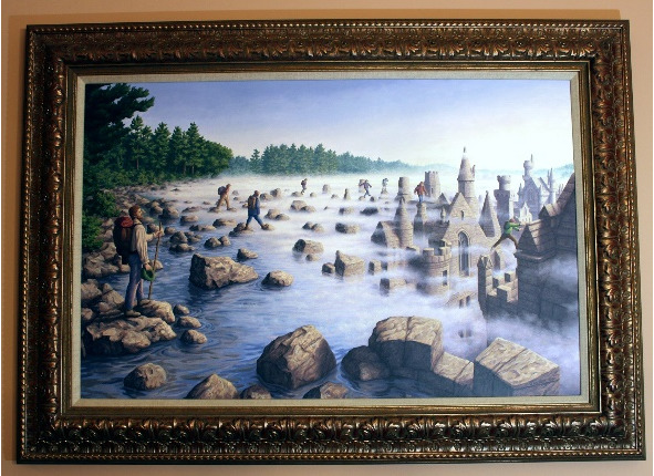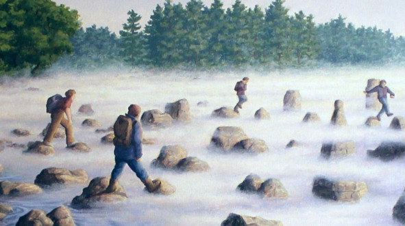 Вот так это примерно выглядит, это фрагмент картины Rob Gonsalves «Stepping Stones»54. Сама картина примерно это и показывает: камушки-ступеньки, прикрытые туманом будущего. Kennet Stanley и Joel Lehman дают именно такую картинку, в которой другого берега вообще не видно, и непонятно поэтому, на какой камушек прыгать, чтобы добраться туда быстрее. Задним числом придут историки и биографы, туман будущего для них отсутствует, и всё это путешествие к успеху для немногих прорвавшихся будет описано как очевидный «прорыв к успеху» (фото на след. стр.).