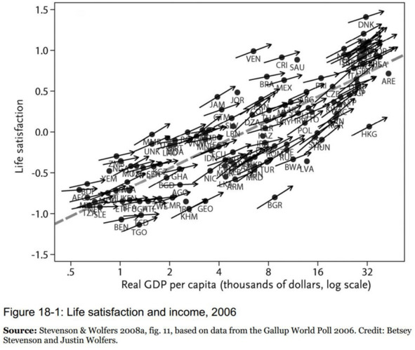 На этом графике доход на душу населения в разных странах приводится по логарифмической шкале и очень чётко видно, что в каждой стране богатые счастливей бедных (угол наклона стрелки каждой страны показывает корреляцию), но уровень счастья в каждой стране сильно отличается, и люди с одинаковым доходом в разных странах счастливы абсолютно по-разному!