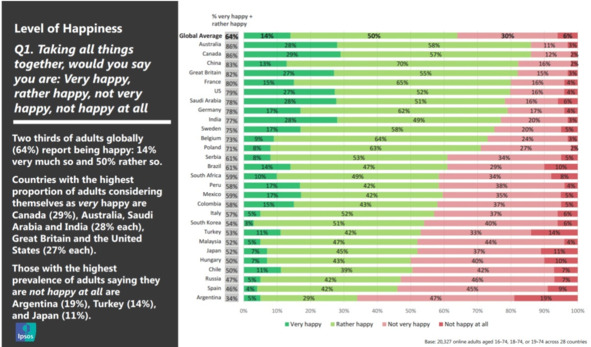 Вот ответ на вопрос о счастье в проведённом агентством Ipsos опросе по удовлетворённостью жизни в 28 странах в августе 2019 года68: