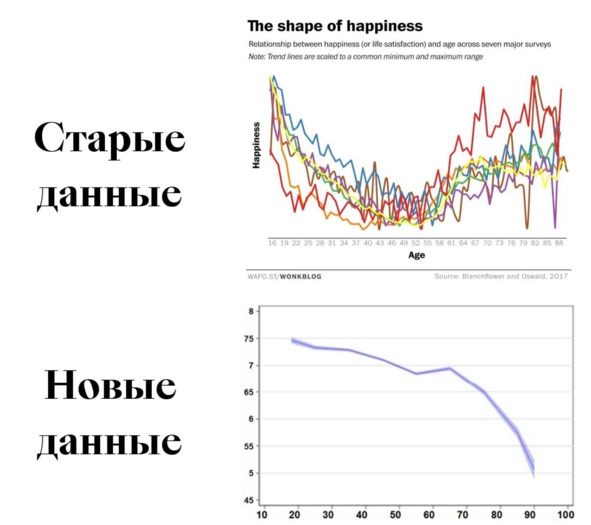 Как поднять счастье? В 2006 году было исследование70, что уровень счастья начиная с какого-то не слишком высокого уровня дохода не зависит от денег. Но в прошлом году провели ещё исследования, и выяснили, что чем больше денег, тем больше ощущение собственного благополучия71. И это новый тренд, тут тоже всё меняется: в прошлом веке счастье действительно меньше зависело от дохода! И уже понятно, что ответ на вопрос зависит даже не от дохода, а от страны проживания и от возраста!